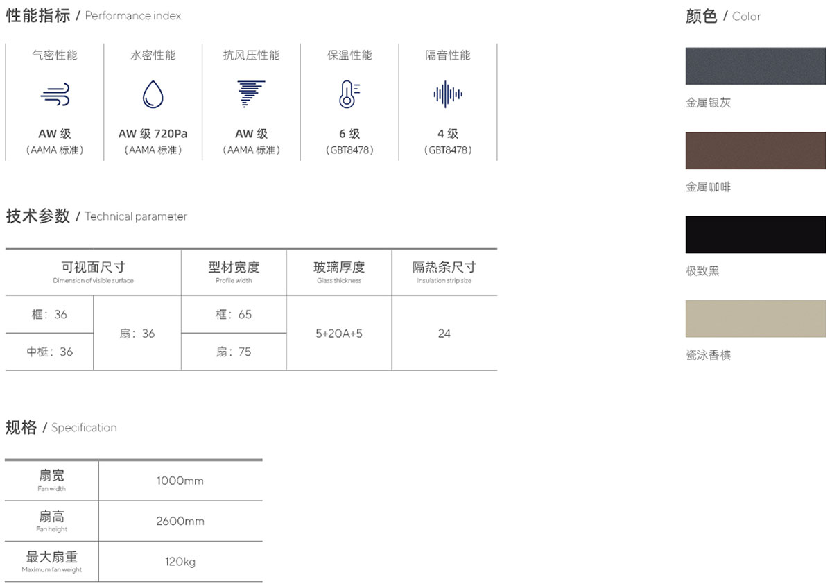 - 門系統設計有低門檻結構(20mm)和無門檻結構設計,均為膠條密封,密封性好,杜絕低門檻結構的門底漏風。